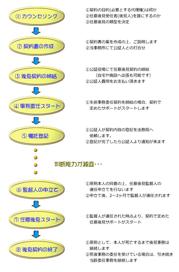 以下に任意後見制度(移行型)の契約締結から、その効力が生じるまでの流れをご説明致します。